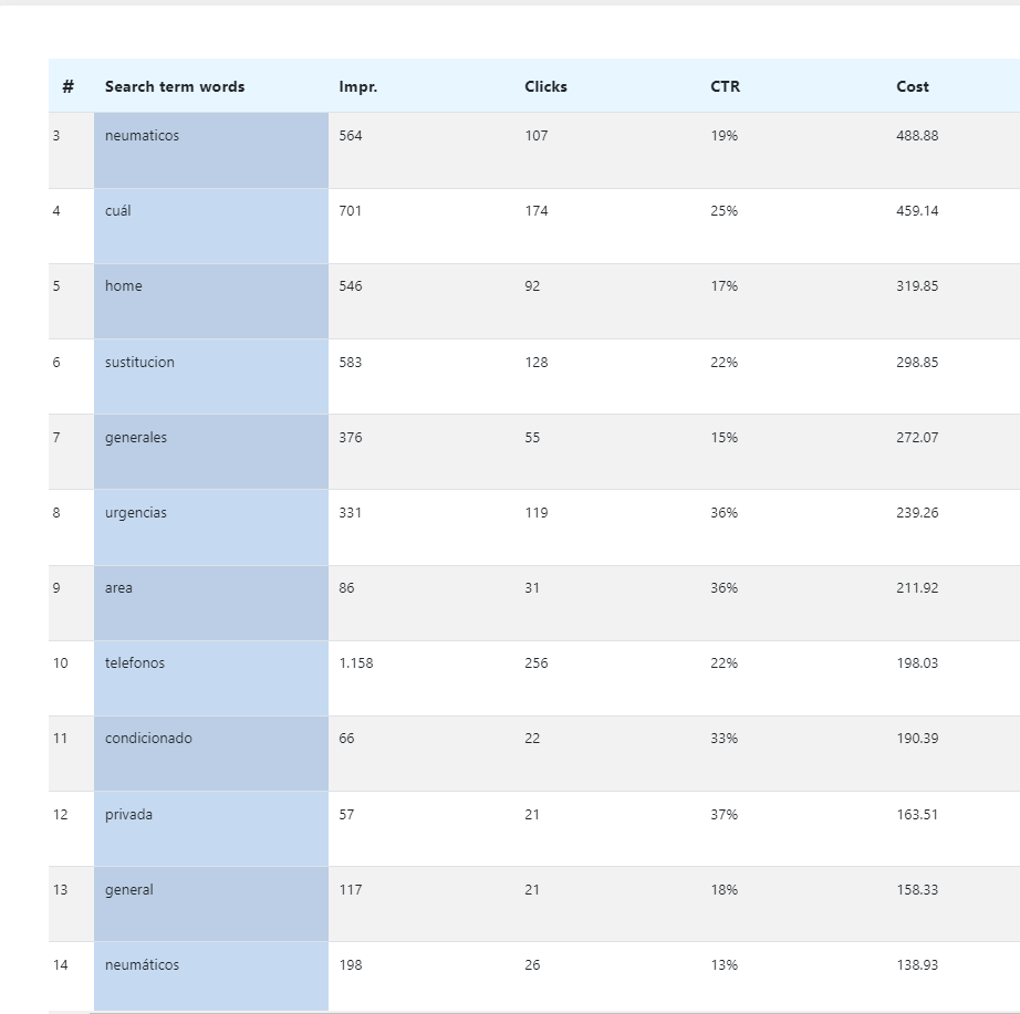 Se desmenuza el Search Term report en palabras únicas. En filas verás cada palabra junto a sus KPIs y las búsquedas y palabras clave por las que han entrado estos términos para poder entender mejor su contexto y qué tipo de tráfico está atrayendo cada palabra.
