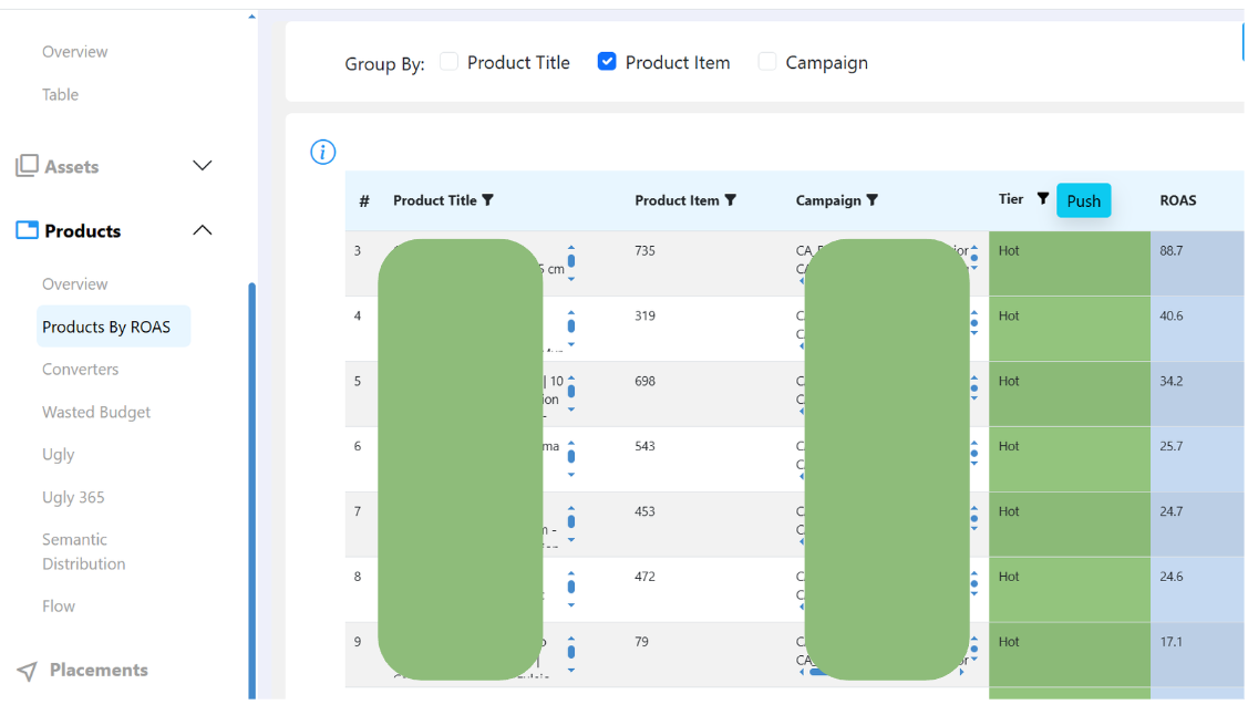 Click “Push” from the Product by ROAS section or when launching the report, check the option Publish Tiers Automatically.