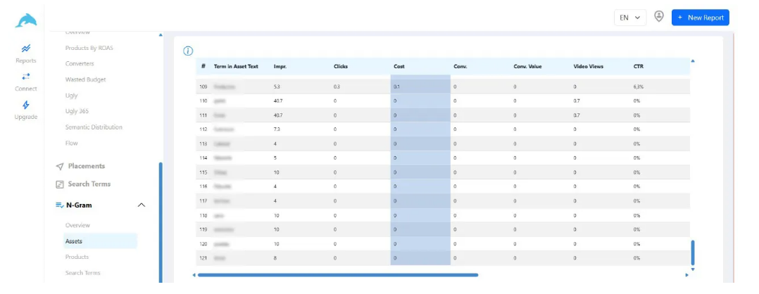 The N-Gram helps you not only with negatives, but also with creative patterns. It allows you to fine-tune much more and reach the maximum level of detail, to understand if it is better to say: "Buy now" or "Get it now". You will know if "gafas" or "lentes" works better for you.