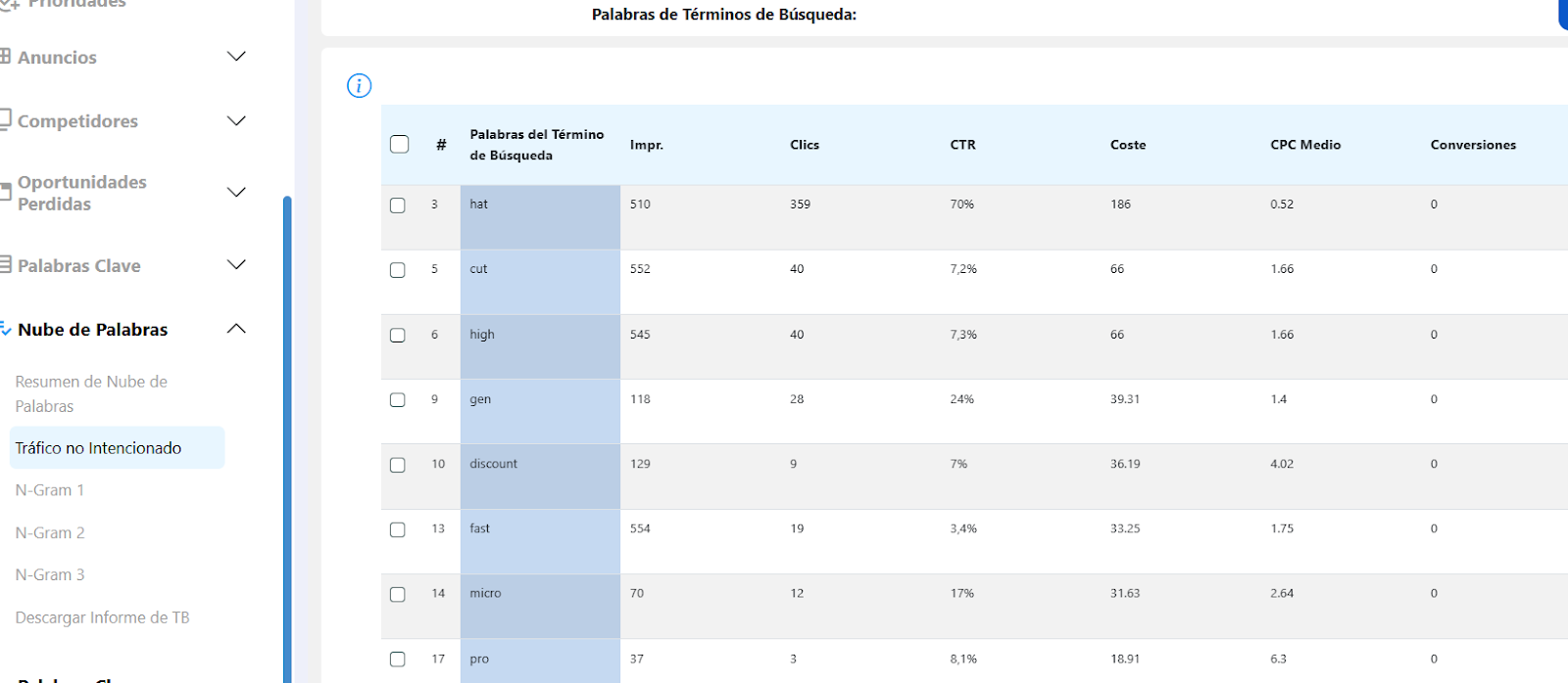 Al clicar en estas palabras clave podrás ver sus términos de búsqueda y sus competidores. Excluye como negativas aquellos por los que no te interese pujar.